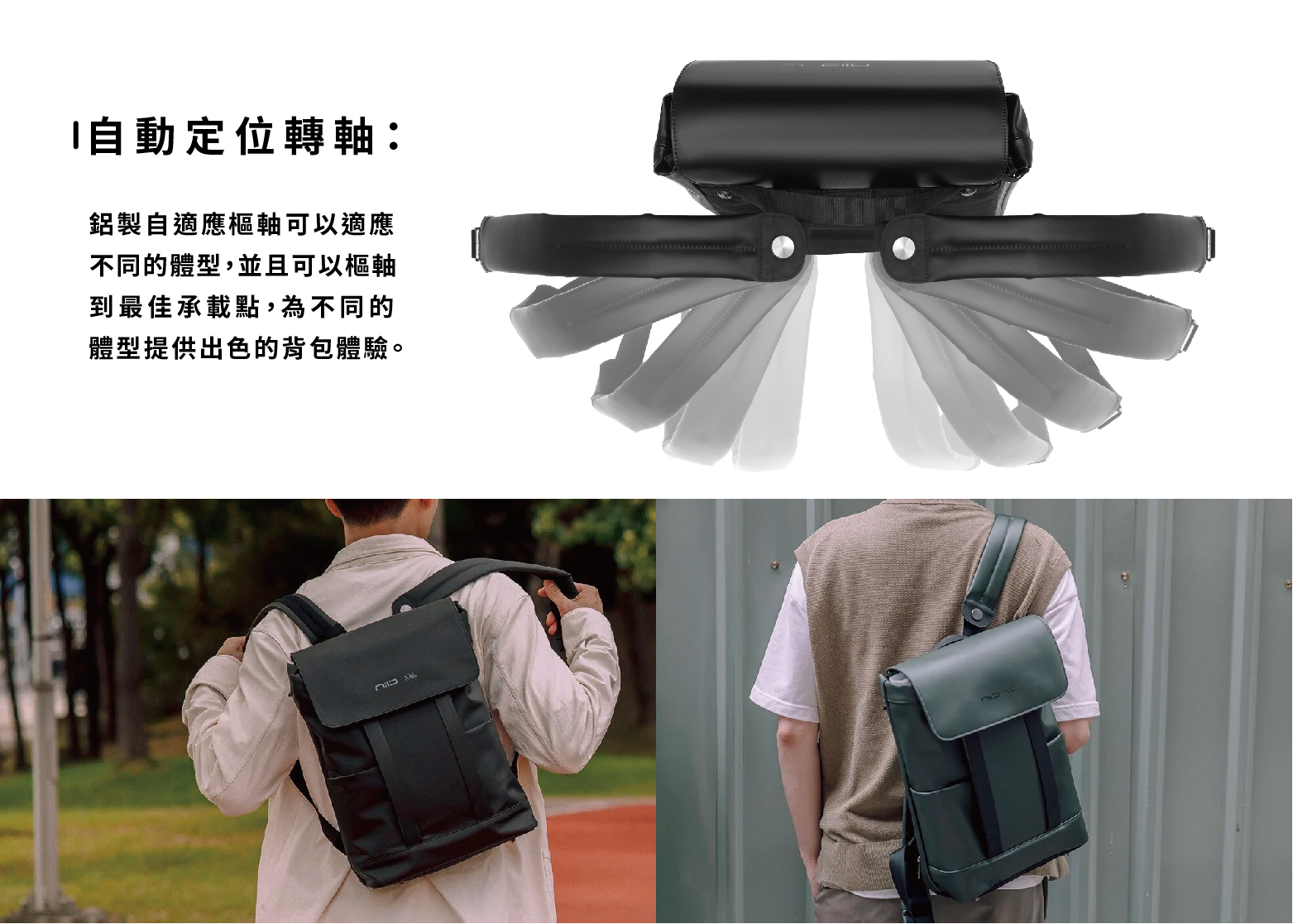 ■ 自動定位轉軸,隨你怎麼背都不卡