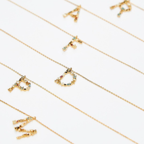 系列字母首飾由天然鋯石打造,每個字母與形狀均採手工雕刻,以大小不一的彩色天然寶石鑲嵌排列,鏈條部分採 925 純銀結合 18K 鍍金,排列出專屬英文字樣,項鍊長度 35-50 公分,可依照當日穿搭與風格調整長度,舉手投足間展現女人獨特魅力