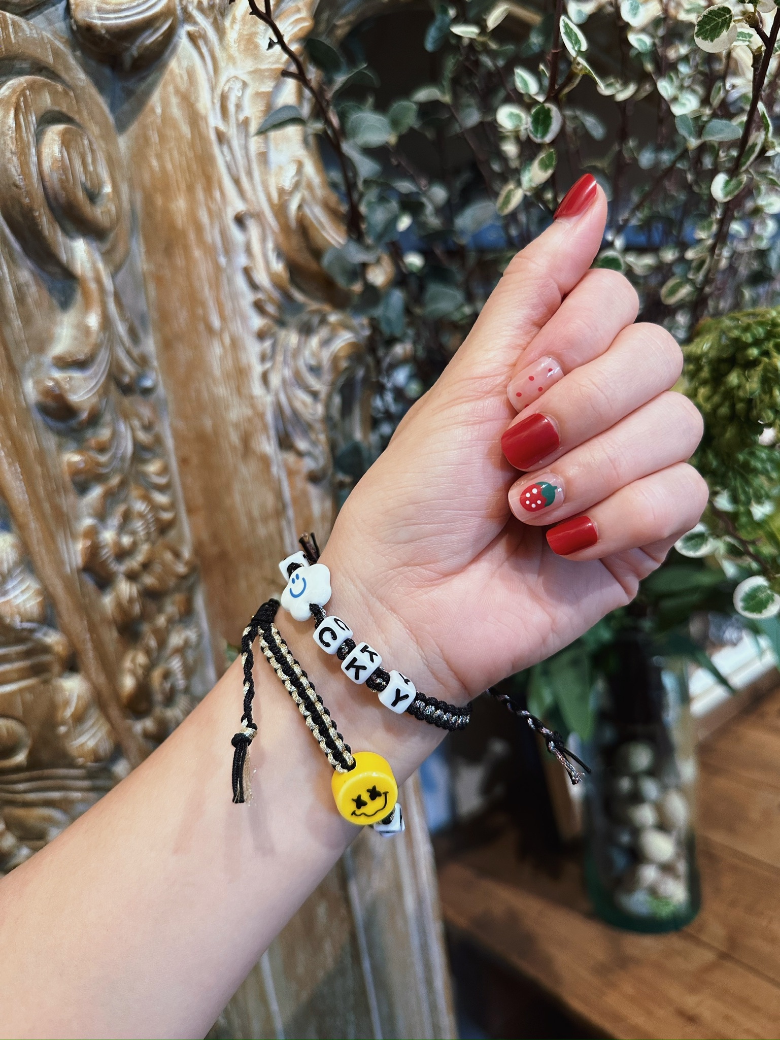 HBSD=HappyBirthday!生日是充滿祝福值得慶祝的一天,更希望戴著這手環,每天都是生日,每天都值得過的開心。小姐姐們對於生日是不是百感交集,感到快樂的同時,看著那增加的數字,又讓我們的笑容稍稍有點歪掉,這複雜的心情~姐都懂。所以特別選用這款笑臉,代表那錯中複雜的滋味,笑著笑著就哭了然後又笑了⋯哈哈哈。祝我們都能在快樂的氛圍裡,體會各種感受,讓這些數字成為驕傲,過的幸福。手工編織不完美,但都是獨一無二的,充滿愛與祝福,自己用或送姊妹都超適合唷!