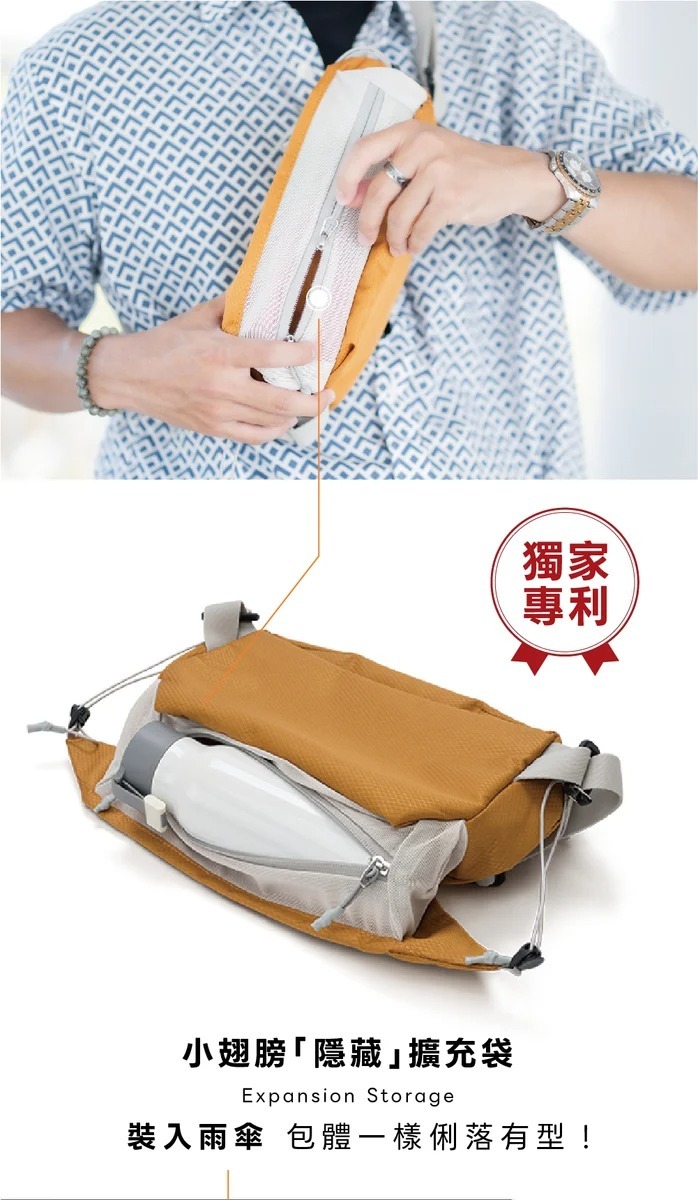 ● 底部「隱藏翅膀」擴充袋,秒收雨傘/水壺!